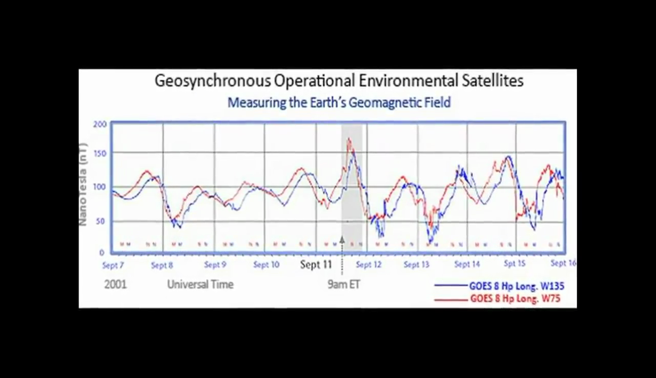 Gregg Braden purports that people watching the news on September 11 produced an emanation that altered the Earth’s electromagnetic field. He shows a graph, and he says it is a classified reading in nanotesla by NASA.