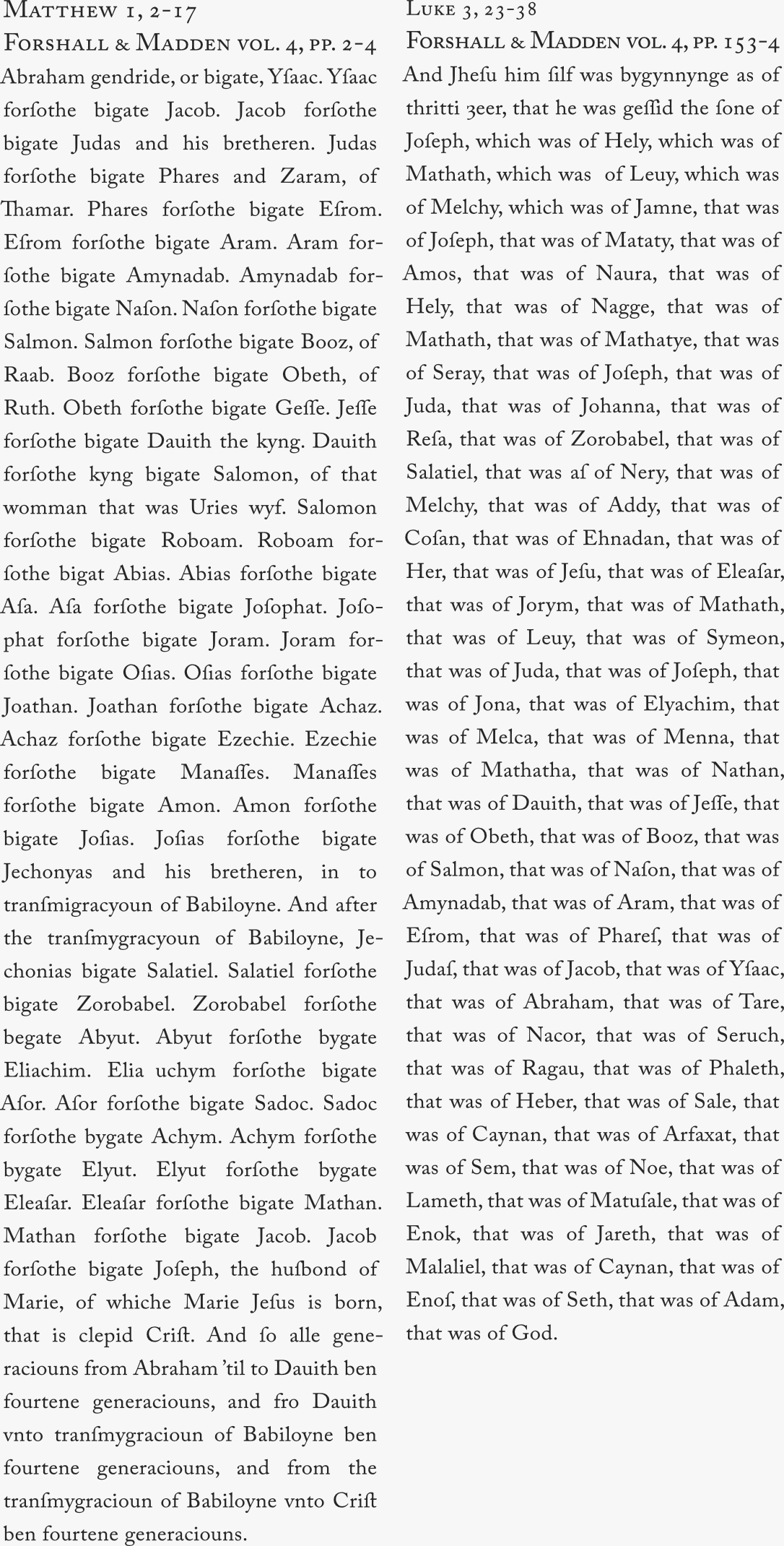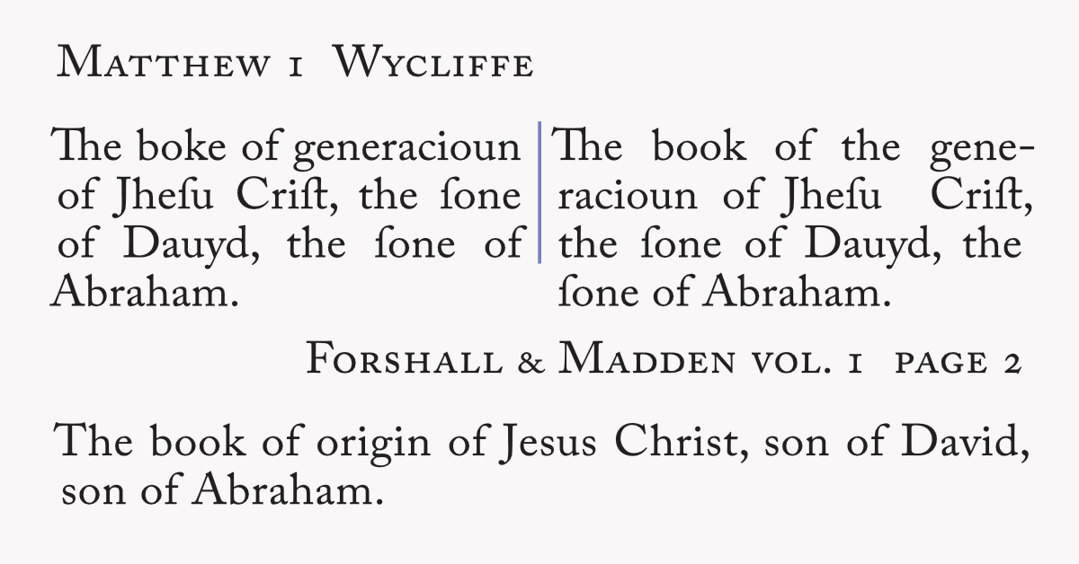 The boke of generacioun of Jhesu Crist, the sone of Dauyd, the sone of Abraham. Wycliffe vol.4. page 2.