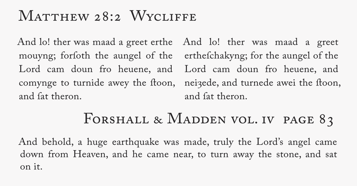 And lo! ther was maad a greet erthe mouyng; forsoth the aungel of the Lord cam doun fro heuene, and comynge to turnide awey the stoon, and sat theron. Wycliffe Bible vol. 4, page 83.